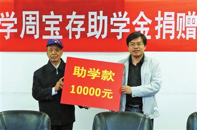 周宝存第一次捐款是在1988年,那时候他还是普通工人,看到淮河发大水,就想给灾区捐些钱,他拿出了50元,在厂里普通职工中是最多的,基本上等于他当时一个月的工资。厂里把光荣榜张贴出来,他的名字排在第一位,他觉得很荣耀,从此他的心里就种下了做善事的念头。周宝存是青岛整流器厂退休职工。2011年11月,周宝存带着自己积攒的1万元钱,走进青岛大学,资助5名贫困大学生每人2000元。
