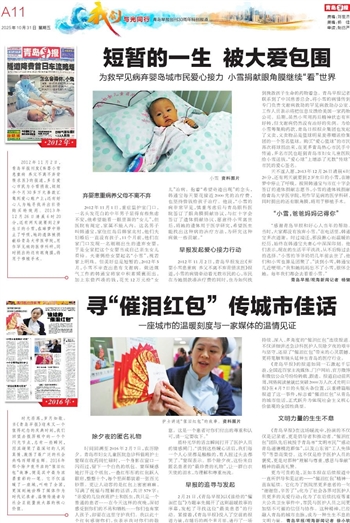 2012年11月2日,青岛早报刊发《弃婴小雪患重病 养父不离不弃背债求医》的报道,多名爱心市民为小雪捐款,短短半个月30多万元善款汇集到爱心账户上;还有好心人为她寻找并出巨资购买特效药。2013年12月26日清晨6时20分,还有两天就要到2岁生日的小雪,在睡梦中停止了呼吸,她的遗体被捐献给青岛大学医学院,用作罕见病的医学科研,同时捐出的还有眼角膜,将用于移植手术。