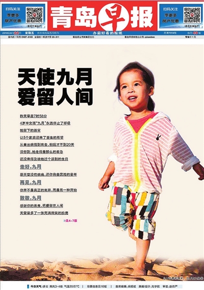 从2018年6月以来,青岛市先后涌现出了九月、和和、小北三位爱心小天使,他们都是在生命的最后捐献器官,挽救他人。他们的故事均通过青岛早报首发讲述,以及国内外各大媒体的转载发酵,让全国乃至世界数亿网友为之动容。青岛早报“天使”系列报道共推出了200多个整版新闻版面,上千条网络推文,用文字、图片、视频等独家的新闻视角,给大家讲述“天使”感人故事,普及器官捐献的知识,引领城市文明新风尚,弘扬城市大爱。