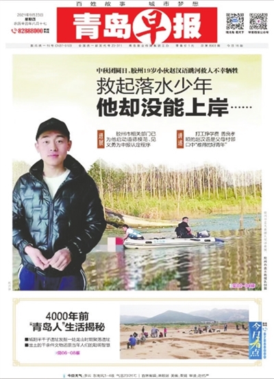 2021年9月21日下午3时许,在村旁胶河边,赵汉语正与姐夫李玉杰一同钓鱼。不远处,三名十四五岁的少年在河边玩耍,其中两人下水,不久,一人开始挣扎。赵汉语见状,纵身跃入河中游向溺水少年。“我离得远,手里抱着孩子,一下子慌了神。”回忆起当时情景,李玉杰立即电话求助妻子赵欣,让她喊人来帮忙。