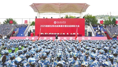 青岛黄海学院发挥典礼文化育人功能,图为学校2025级新生军训成果展示暨总结表彰大会。