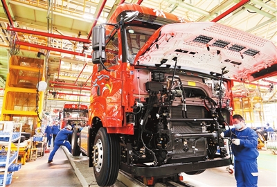 一汽解放总装车间,工人在组装卡车。
