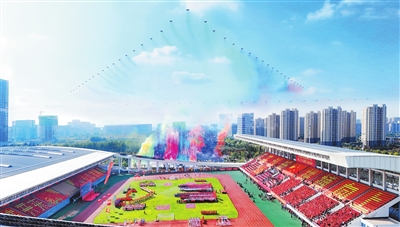 盛大的开幕式现场彩烟升腾,70架无人机翱翔天空。