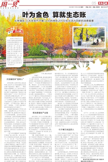旅拍公司的员工小孙卖力地通过视频直播向各地网友推荐到八大关拍银杏大道照片,北宅街道工作人员在山路上跑上跑下查看去往神清宫的道路是否通畅,竹子庵银杏树下游客悠闲品茶……这些现象的背后,是一本需要精心计算的“金色”账本——人们的出行、餐饮、住宿等消费行为正在催热生态画卷的“美丽经济”。