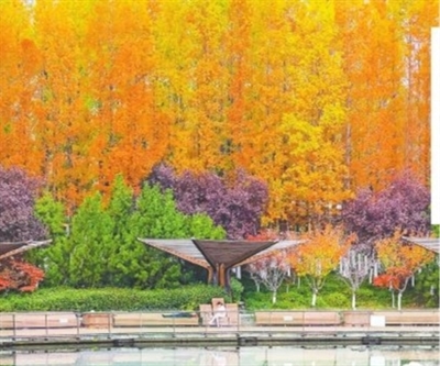 世博园水杉色彩倒映在湖面。 张鹰 摄