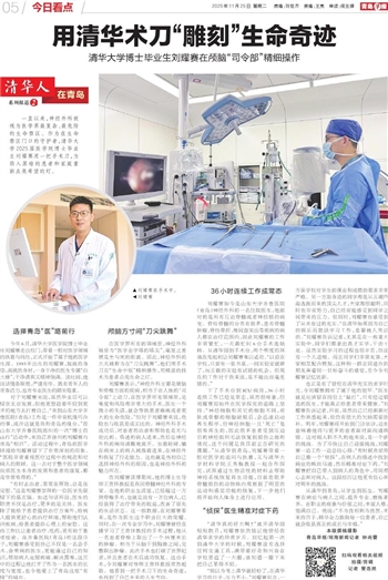 刘耀赛如今是山东大学齐鲁医院(青岛)神经外科的一名住院医生,他面对的是所有压迫脊髓或者神经根的病变。脊柱脊髓的分类有很多,患有脊髓肿瘤、脊柱骨折、椎间盘突出等疾病的病人都在治疗范围内,因此刘耀赛的工作非常繁忙,一天最忙时6台手术连轴转。从清华园到手术台,两个维度的环境改变起初让刘耀赛难以适应。“以前在学校,只要有一张书桌、一间实验室就够了,而且做的实验有试错的机会。但现在的工作对于我来说,是不能出丝毫差错的。”