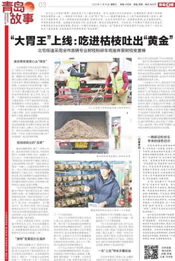 从线上灵感到线下验证,这场跨越千里的长沙之行,为北宅街道解决“树枝难题”敲定了最终方案。去年10月,承载着期望的青岛首台树枝移动粉碎车正式在北宅街道“上岗”。