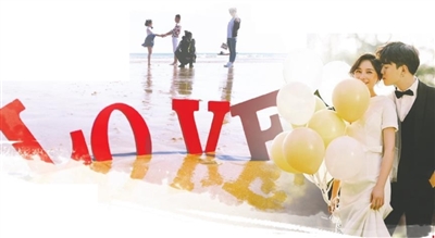 组图:第三海水浴场沙滩成为新人外拍的“浪漫海湾”。