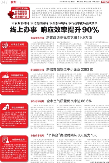 2025年,青岛市农业农村局、市民营经济局、市生态环境局、市行政审批局聚焦高质量发展,交出一份亮眼“答卷”。市农业农村局新建和改造高标准农田19.9万亩,带动夏粮实现“三增”;市民营经济局培育创新型中小企业5510家,民营经济贡献持续增强;市生态环境局完成1508个减排项目,空气质量优良率达88.6%;市行政审批局推动“高效办成一件事”,助力2600余户个体户转型为企业。多项改革举措与成效位居全国、全省前列,为城市发展注入强劲动能。