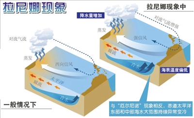 拉尼娜为赤道太平洋东部和中部海表温度大范围持续异常变冷的现象。至今,气象学家们还不能完全解释拉尼娜出现的原因,人们只是观察到,每隔2年至7年,赤道附近太平洋上的偏东信风会突然增强,强劲东风吹拂下,赤道东太平洋表层的暖海水被推向太平洋西部堆积形成异常偏暖的暖区,而赤道东太平洋深层的冰冷水大量上涌补充,导致这一带海水温度异常偏低。