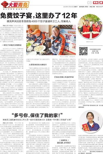 多年来,谭洪声夫妇还一直关注着社区内80岁以上的高龄老人,每当有老人过生日,他们都会与社区工作人员一同送上寓意长寿的面条。“虽然礼物不贵重,却满载着我们对老人们的深情厚谊。”谭洪声说。而在夏玉波眼中,这些看似平凡的善举,却有着不平凡的意义:“谭老板特别有爱心,我们就应该宣传这样的好人。一盘冬至饺子,把满满的爱心和祝福都融入了情谊之中。”