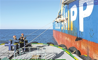 救援小组按照预先推演的方案,迅速展开行动。一名经验丰富的船员操控船吊,缓慢调整吊臂角度,将救生担架精准送至“安池”轮甲板上方;另两名救援人员则在船舷处做好接应准备,与“安池”轮的船员默契配合,小心翼翼地将患病船员妥善安置在担架上,并用固定带牢牢固定,防止转运过程中发生磕碰。