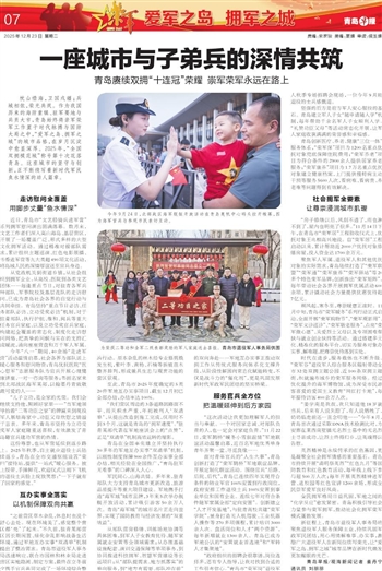 枕山襟海,卫国戍疆;兵城相依,荣光共筑。作为我国历来的海防重镇、驻军要地与兵员大市,青岛始终将崇军荣军工作置于时代脉搏与国防大局之中,“爱军之岛、拥军之城”的城市品格,在岁月沉淀中愈显深厚。2025年,“全国双拥模范城”称号第十次花落青岛。这座城市的坚守与创新,正不断续写着新时代军民鱼水情深的动人篇章。