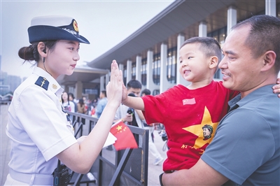 今年9月24日,北部战区海军舰艇开放活动在青岛奥帆中心码头拉开帷幕,图为海军官兵与参观市民亲切互动。