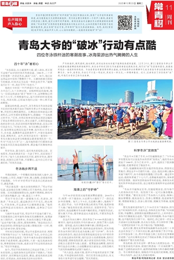 青岛的海,因为有这样一群冬泳人而更加生动。常年在复杂海况中游泳,使他们熟悉每一片水域的脾气,练就了过硬的游泳技术、超常的耐寒能力和冷静的判断力。冬日刺骨的海水,锤炼的不仅是他们的体魄,更是一种由内而外、由己及人的城市精神。