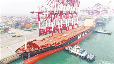 澳洲直航新航线首班船舶——“地中海杰西尼亚”轮靠泊山东港口青岛港。新华社发