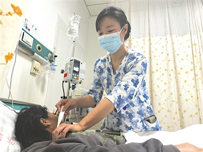 孙晓昱使用电子体温计为患者测体温。