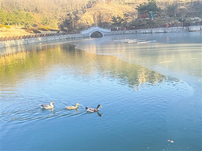 浮山森林公园文翠湖冰面融化,鸭子悠闲戏水。