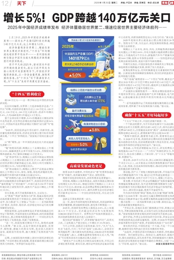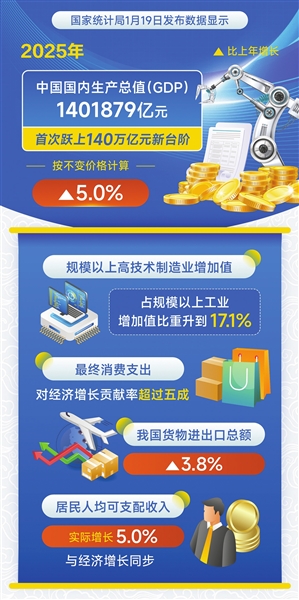 1月19日,2025年中国经济成绩单发布——国内生产总值(GDP)首次跨越140万亿元大关,比上年增长5.0%。