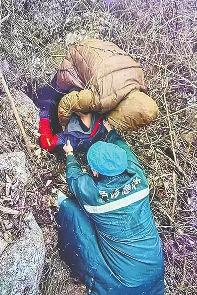“现场环境比预想中更凶险。”参与救援的青滨附院急诊科护士张恒回忆,被困者身处草坡与乱石构成的细长平台,两侧是深不见底的悬崖与纵横交错的巨石沟壑,仅能借助岩石滑行通过,稍有不慎便可能坠落。在救援人员与民警的协同帮助下,张恒才艰难穿越乱石堆抵达被困者身边。此时,被困者已意识模糊、无法应答,身体因长时间暴露在寒风中极度虚弱。张恒迅速检查其生命体征,确认颈动脉搏动虽稍缓,但清晰可辨,双眼对光反射正常,暂无生命危险。医护人员立即取出全程保温的葡萄糖,在家属协助下为其喂食,及时补充体力,为后续救援争取宝贵时间。
