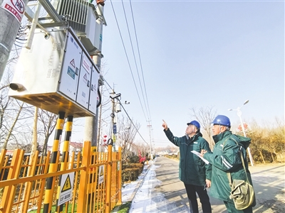 即墨区供电公司工作人员在柳林村查看改造后的电网。