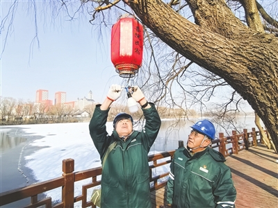 即墨区供电公司工作人员在柳林村检修民宿照明灯。