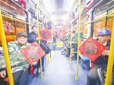 1月26日4时45分,刘法杰已经完成车辆预热,提前将102路区间车开至大村庄始发站。当第一批“新市民”登上这辆“年味暖途巴士”时,一份惊喜正在降临。刘法杰将一份份特别的“新年礼”送到大家手中——那是李沧巴士工作人员亲手书写的“福”字以及精心准备的“暖心福袋”。刘法杰笑着解释福袋里的“玄机”:“我们准备了苹果,寓意平平安安;准备了糖果,希望日子甜甜蜜蜜;还有一个暖手宝,路上拿着,手暖心更暖。”接过满载心意的福字和福袋,“新市民”们的脸上写满了惊喜与感动。
