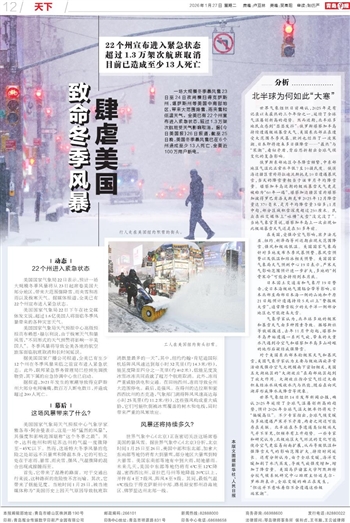 一场大规模冬季暴风雪23日至24日夜间横扫得克萨斯州、堪萨斯州等美国中南部地区,带来大范围降雪、雨夹雪和低温天气。全美已有22个州宣布进入紧急状态,超过1.3万架次航班受天气影响取消。据《今日美国报》26日报道,截至25日晚,美国冬季暴风雪已在6个州造成至少13人死亡,全美近100万用户断电。