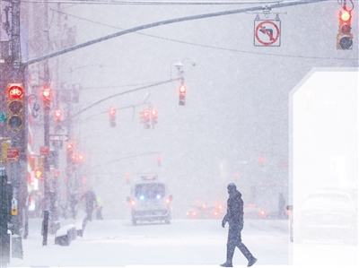 行人走在美国纽约积雪的街头。