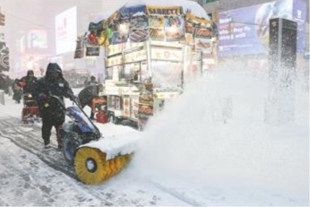 工人在美国纽约街头扫雪。