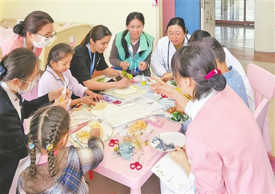医护人员、志愿者跟小患者一起做手工。院方供图