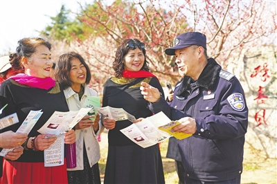 青岛市公安局李沧分局民警因地制宜,将宣传阵地搬进梅林花海,采取“见缝插针”的流动宣讲方式,趁着游客购票、观景、休憩的间隙,主动靠前、贴心宣讲。把生硬的法律条文、安全常识,转化为接地气、记得牢的温馨提示,让安全宣传融入赏花全过程,不扰雅兴、效果十足。