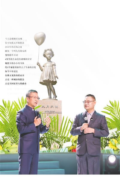 ●活动第一篇章《爱的星火》集中展示了青岛早报新闻人物“九月天使”故事,青岛早报记者孙启孟现场深情讲述采访小九月的经过,青岛沙画师孙霖展示为小九月创作的沙画作品《天使的馈赠》,青岛军旅歌手王蒨现场演唱青岛词曲作者为小九月原创的歌曲《你是天使来人间》。