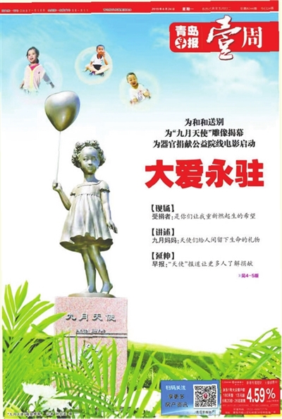 ——艺术家精心创作的“九月天使”雕塑矗立在面向大海的青岛雕塑园内,成为青岛的城市爱心文化地标,雕塑园工作人员自发成立“大爱有声”志愿宣讲团,义务讲述九月故事,普及器官捐献知识。