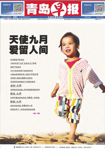 2018年6月21日,九月去世当天,青岛早报微信公众号在全国率先推送《记住这个天使!今天,一位青岛4岁女童因病离世,她捐献器官救5人》,瞬间引爆网络。短短两天,阅读量突破100万次,留言评论超过万条。人民日报、新华社、中央电视台等全国40多家主流媒体直接转发或编发早报的报道,九月的故事从青岛走向全国。
