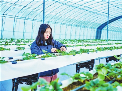 胜水村草莓大棚内,种植户杨治香也忙得不亦乐乎。“草莓正处盛果期,每天采摘分拣、疏花疏果,虽然忙,但订单不断,心里踏实。”她种草莓8年,以前管理不精准,品质参差不齐、销路不稳,引入智慧设备和绿色种植技术后,“大场草莓”名气渐响,订单源源不断。