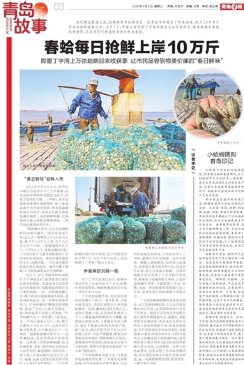 春潮不息,耕海不止。如今,丁字湾、胶州湾的蛤蜊丰收季正火热持续,每日数十万斤鲜蛤源源不断走向市场,既装满了渔民的钱袋子,也丰富了市民的菜篮子,更点亮了青岛的春日鲜味。这片孕育美味的海湾,见证着渔民们的坚守与付出,承载着青岛的海鲜文化与城市烟火,小小蛤蜊,以其独有的鲜美,在黄海之滨续写着耕海牧渔的丰收故事,成为青岛这座海滨城市永远抹不去的鲜活印记。