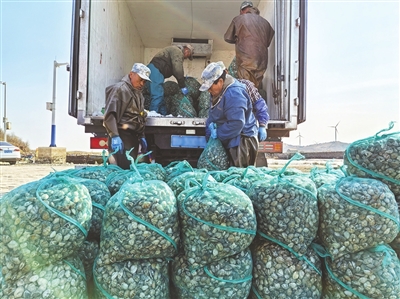 蛤蜊刚上岸就装车运往市场。