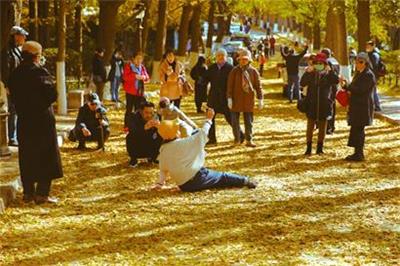 两日的大风降温天气使得八大关景区居庸关路的银杏叶提前飘落,满地金黄。
