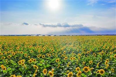 在平度市同芮农业农耕文化教育基地,大片的向日葵盛开。据了解,这里向日葵的总种植面积达到500亩。