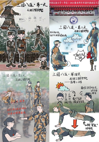 “我从小喜欢画画,虽然没有经过系统的专业训练,仅凭着热爱和兴趣坚持下来。”许昕月告诉记者,从小她就喜欢把看到的风景用画笔记录下来,长大后,她自学了素描人像、石膏像、水彩画等。点开许昕月的手绘作品,记者看到,画面里有参训学生在雨中列队训练、在烈日下站军姿、在休息期间展示才艺……人物形象生动有趣,动作描绘栩栩如生。为了让画面更鲜活,她还用对话气泡和Q版人物的画风展现当时情形,不少学生都将漫画保存下来,相互传阅。