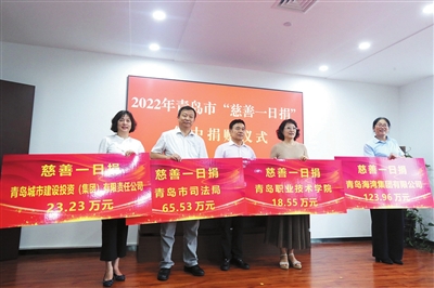 2022年的“慈善一日捐”活动于5月20日启动以来,通过贯彻落实市委“作风能力提升年”活动,全市上下积极行动、踊跃参与、奉献爱心。截至7月8日,市慈善总会累计接收“一日捐”捐款433.77万元。本次集中捐赠仪式,青岛市纪委监委、青岛市发展和改革委员会、青岛市民政局、青岛市司法局、青岛市城市管理局、青岛市人民检察院、国网山东省电力公司青岛供电公司、青岛海湾集团有限公司、青岛城市建设投资(集团)有限责任公司、青岛职业技术学院、青岛市广播电视台、利群集团12家单位进行了捐赠,共捐款334万余元。其中,海湾集团捐款123.9627万元,员工参与率达到100%,比去年增长10.26%,成为目前全市“慈善一日捐”活动收到的数额最高的捐款。青岛市司法局捐款65.5252万元。
