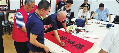 在临时布置的书画室里,市北区作家协会会员、青岛市楹联协会副主席刘宝芝,中国书法家协会会员、青岛聚贤阁书画院副院长周长东,中国书法家协会会员、中国楹联学会会员尹清深,中国楹联艺术家协会会员、国家一级美术师卜范勋,高德金等十几位知名书画家现场伏案挥毫,笔走龙蛇,写出了一幅幅浸染着军魂和信仰的作品。