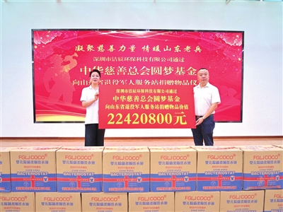 此次向山东省部分村级退役军人服务站捐赠的物资包括净水器6400台、太阳能路灯6400台、洗衣液48000桶,共计价值2242万余元。