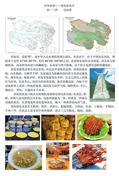 同学们踊跃参与,选择自己感兴趣的省级行政区进行云研学,搜集整理资料介绍其自然和人文地理环境特点,“挥毫提笔画我山河,剑锋千轫画这巍峨,滔滔江水走笔龙蛇,我丹青不渝画我中国……”用一幅幅精彩的作品呈现了自己心中的壮美山河,以地理视角感受浩瀚中国。“地藏经纬,理统九州。”青岛59中地理组学员王源鑫说,通过主题实践活动,自己更好地领略了祖国的壮美风光。翻开学生们的作业,首都北京、古都西安、魔都上海、西域新疆每一座城市的交通、地理、文化、美食和成长历史,学生们用图文、表格和各种手账粘贴的方式,设计出花样十足的作品。