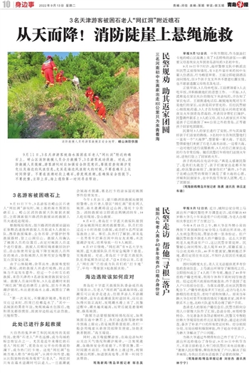 8月17日傍晚,“网红洞”有9名大学生被困,蓝天救援队队员用安全绳降下悬崖,实施救援。对此,青岛红十字蓝天救援队队长李延照告诉记者,“自8月份以来,石老人‘网红洞’已经成为队员们的‘打卡地’了,平均一周接到3起救援求助。”