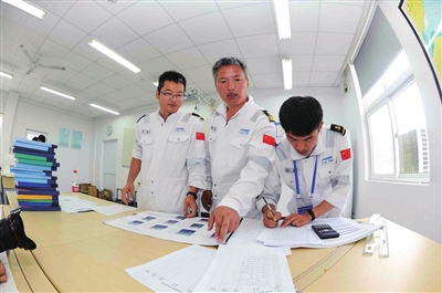轮机长孙宗强向记者回忆,在一次航行过程中,大约清晨5点左右,他们在例行检查时发现某处缸体有大量进水。面对棘手的问题,孙宗强和大管轮、二管轮、电机员们一刻不敢耽搁,立马来到机舱,早饭也没顾得上吃一口,因为设备的安全运转永远是第一位的。查阅图纸,分析故障原因,然后又带领机舱全体人员在超过40℃的机舱里加班加点奋战了两天,最终故障顺利排除,设备恢复正常运转。