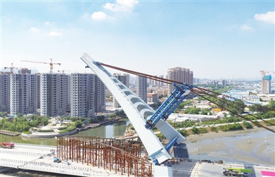 “我们项目采用成套的施工转体技术,保证钢主塔竖转稳定安全。”跨风河新建桥梁工程中建八局项目经理钟仁亮介绍,在桥梁施工过程中,建设团队在国内首次采用大吨位、大丝束碳纤维材料,延长结构寿命;同时采用免栈桥滑移轨道安装、装配式钢栈桥应用、钢箱梁驮运安装等工艺,提高建设效率。