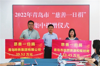 本次集中捐赠仪式,青岛地铁集团有限公司、青岛市自然资源和规划局、青岛国信发展(集团)有限责任公司、青岛市市场监督管理局、青岛华通国有资本投资运营集团有限公司、青岛市住房和城乡建设局、青岛国际机场集团有限公司、青岛市人力资源和社会保障局、青岛市中级人民法院、青岛市农业农村局、青岛能源集团有限公司、青岛红星化工集团有限责任公司、青岛出版集团有限公司、青岛水务集团有限公司等14家单位进行了集中捐赠,共捐善款293万余元。其中,青岛地铁集团有限公司捐款39万余元,青岛市自然资源和规划局捐款33万余元。