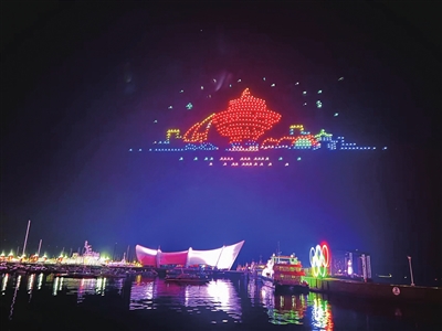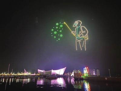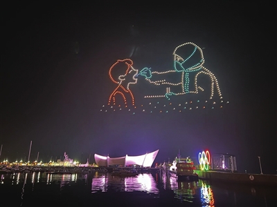当晚,在奥帆中心活动现场,500架无人机凌空而起,如同银河里的星系,在夜幕下变幻出“五月的风”“大白”“口罩隔绝病毒”“社区工作者”“民警”“市民”及“健康码上的闪光金盾”等不同图案,再次上演“青岛式”星空告白。